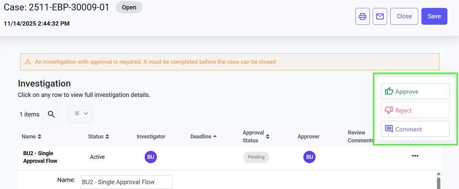 Set Investigation Approval Rules: Require specific roles or stakeholders to sign off before cases progress, reducing risk of missed reviews.